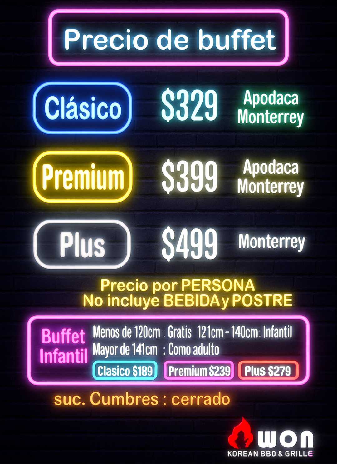 Precio de buffet infaltil menos de 120cm :no paga, entre 121cm a 14ocm : buffet infantil